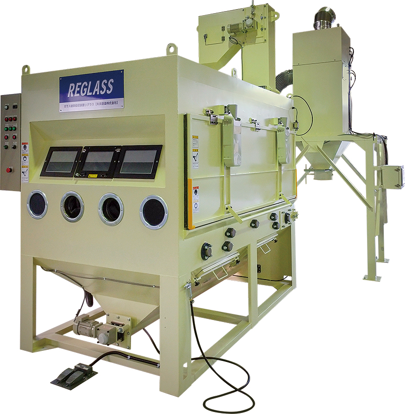 粒状の投射材料を圧縮エアーorモーター駆動によってカバーガラス表面に噴きつけ、カバーガラスを剥離する方法。投射材料は装置内で循環し、連続して使用する事が可能。剥離したカバーガラスはふるい装置で自動的に分別され回収する。